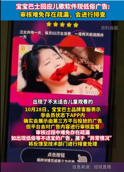 最近,有不少家长发现,宝宝巴士儿歌APP打开时出现低俗擦边广告。不仅有穿着暴露的女士在跳舞,还有“三女共侍一夫”的标题。